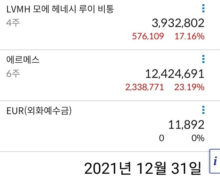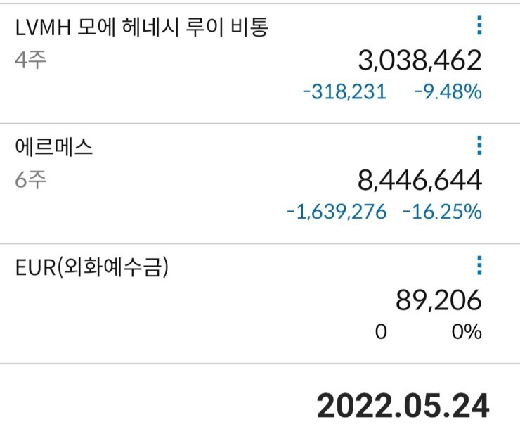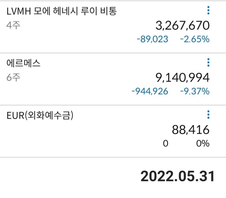 러시아 전쟁도 빨리 끝나고, 코로나19도 빨리 끝나고 에르메스랑 루이비통 주식 모두 모두 쭉쭉 올라 더 우상향 했으면 하는 바램이예요.