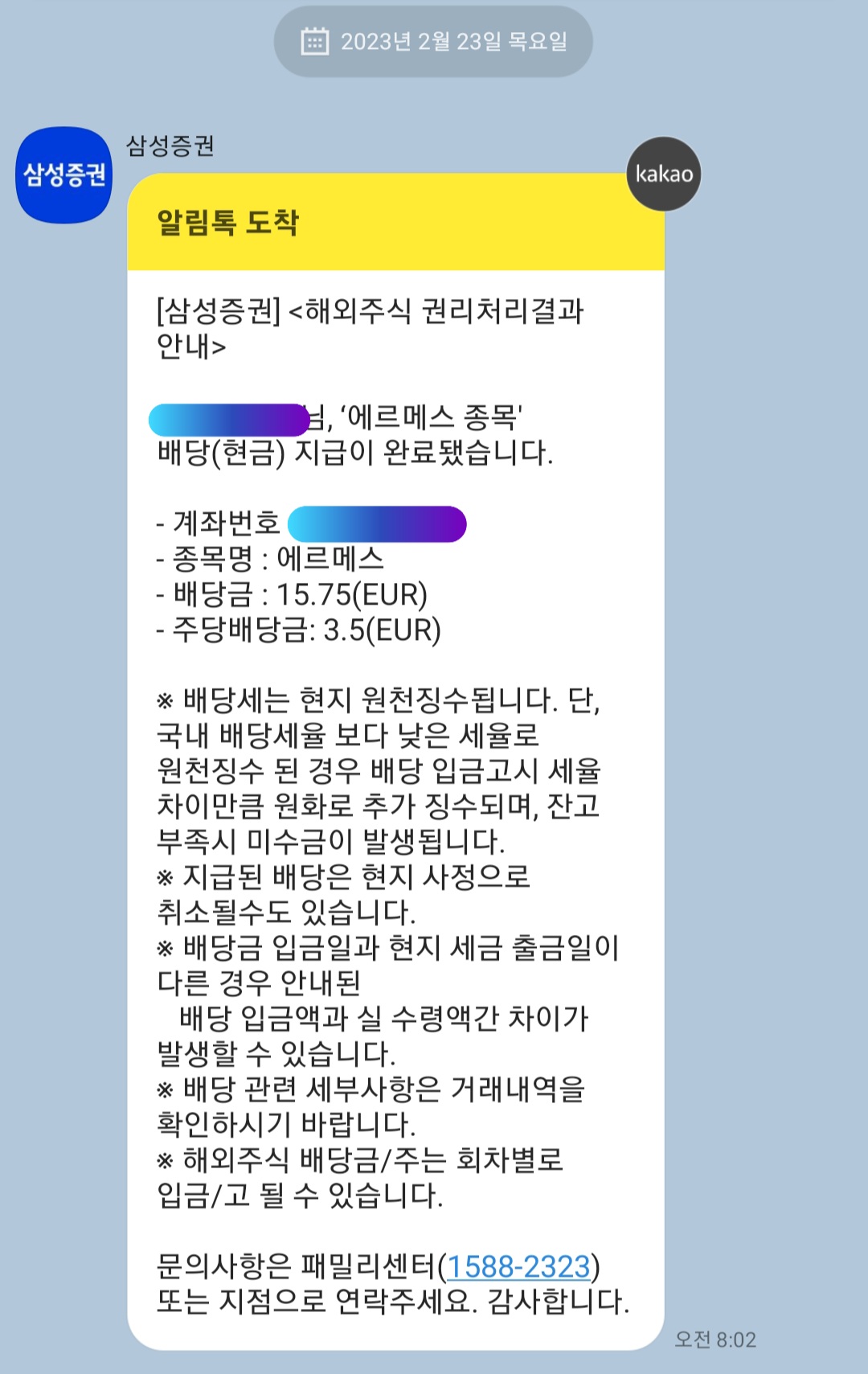 2023년 2월 23일에 에르메스 배당금이 입금되었어요.