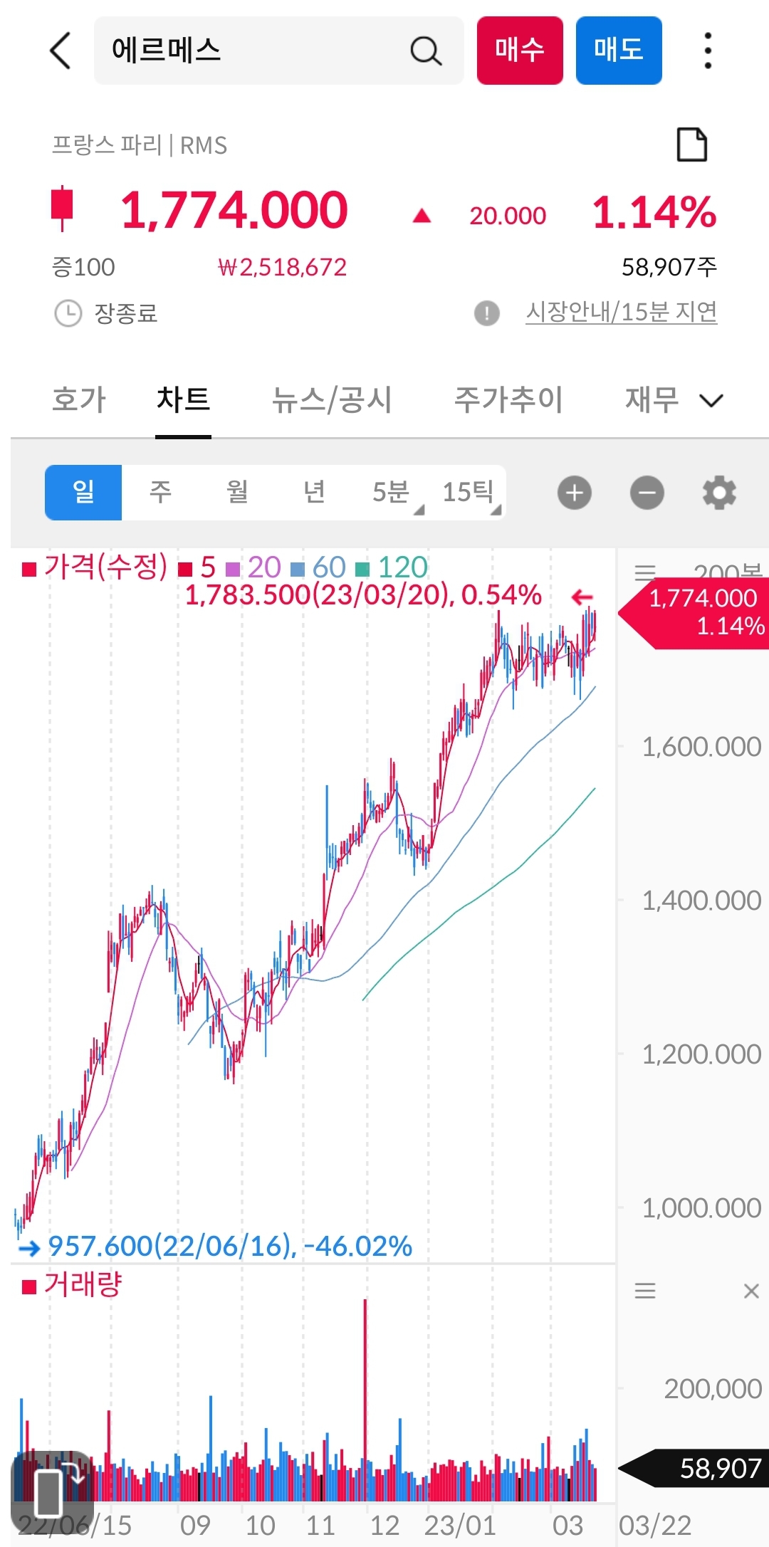 2023년 3월 23일 기준 에르메스 차트 쭉쭉 잘 오르고 있습니다.
