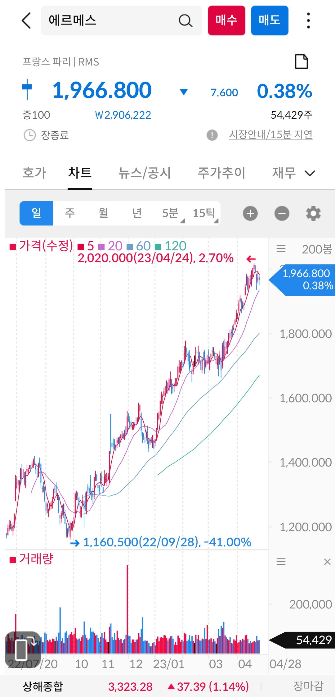 2023년 5월 2일 기준 에르메스 차트 쭉쭉 잘 오르고 있습니다.