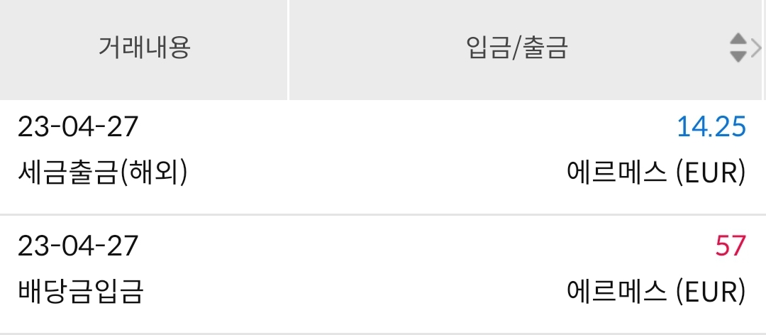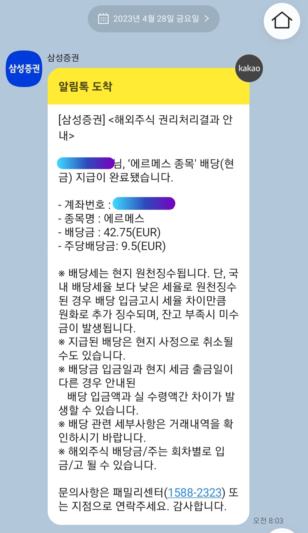 2023년 4월 28일에 에르메스 배당금이 입금되었어요.