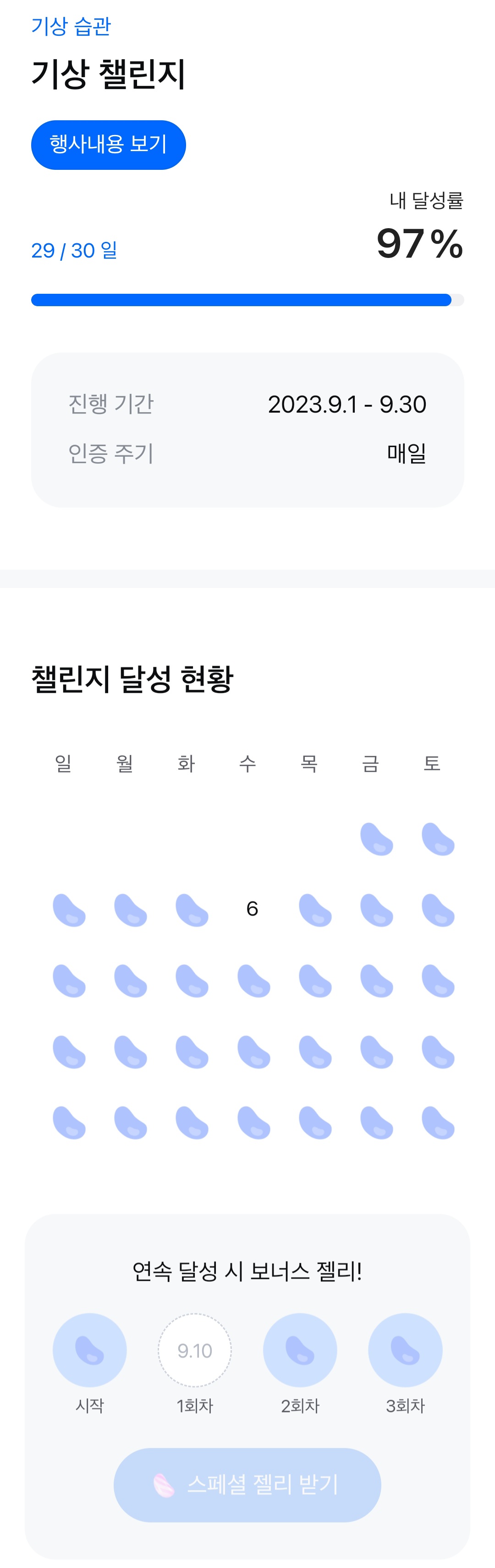 매일 출석체크, 5000보 걷기, 아침 7시 30분 기상인증, 젤리투자하기 챌린지를 통해