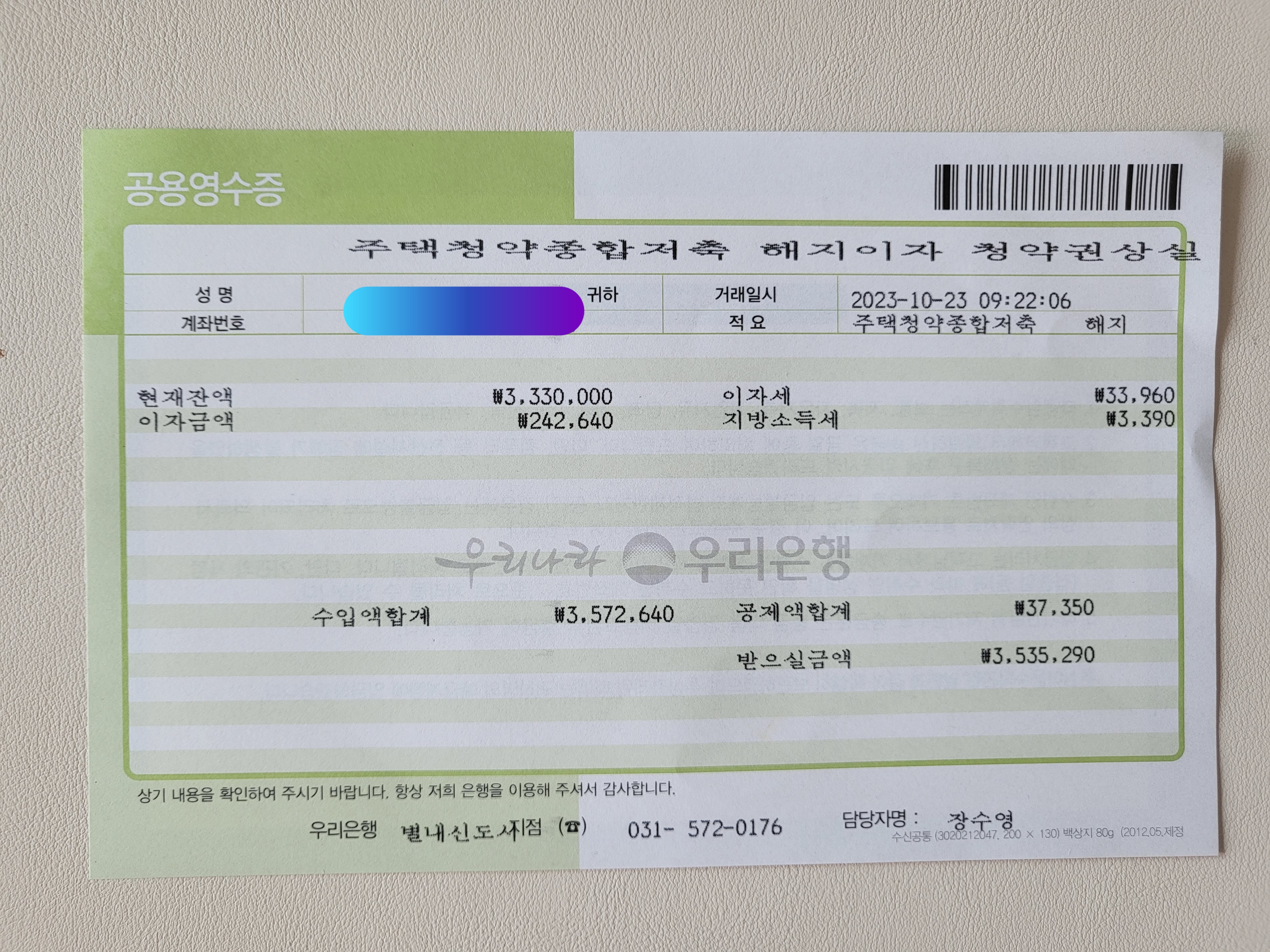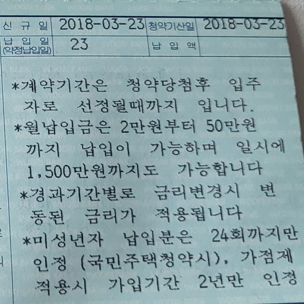 오늘 아이 태어나고 바로 가입했던 우리은행 우리아이행복 주택청약저축을 해지 하였습니다.