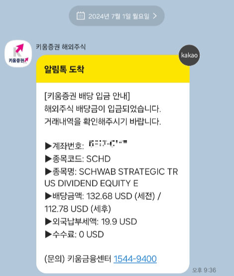 SCHD 24년 7월 배당금 입금 알림톡