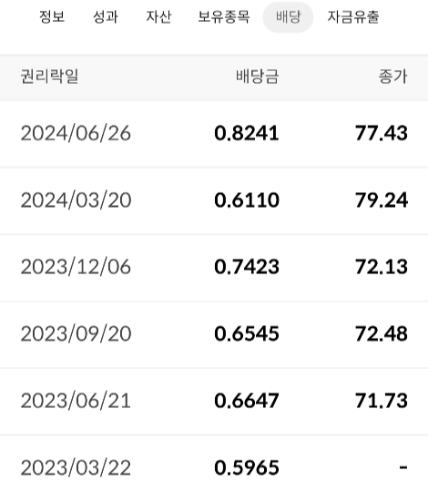 SCHD는 고배당주에 집중해 배당 수익률이 높아요. 최근 배당 수익률은 약 3-3.5% 정도로 QQQ보다 훨씬 높아요. SCHD는 안정적인 배당 수익을 원하는 투자자에게 적합해요. 배당을 재투자하면 복리 효과도 기대할 수 있어요. SCHD 역시 분기별로 배당금을 지급하며, 최근 배당은 2024년 6월에 주당 $0.8241이었어요.