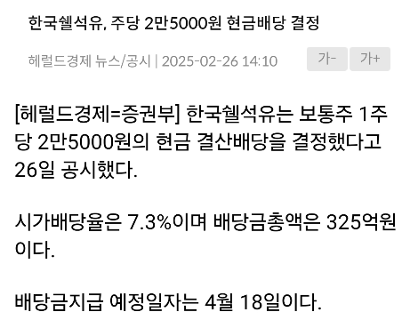 한국쉘석유 24년 결산간배당 결정 뉴스 저는 작년 12월 기준 10주를 가지고 있어, 4월 18일에 배당금으로 25만 원을 받을 예정입니다.