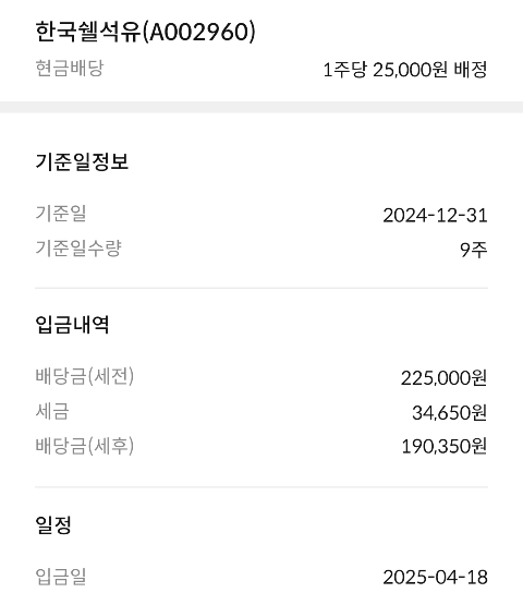 오늘은 어제 받은 한국쉘석유 배당금으로 추가 매수를 진행한 이야기를 공유해보려고 해요. 저처럼 배당 투자에 관심 있는 분들에게 도움이 되길 바랍니다.2025년 4월 18일, 한국쉘석유 배당금이 들어왔어요