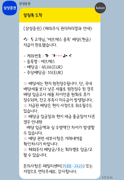 5월 10일 토요일 아침 에르메스 배당금이 입금되었다는 알림톡을 받았습니다.